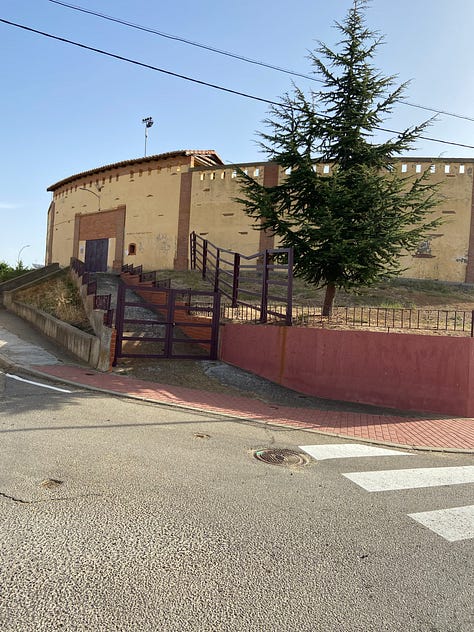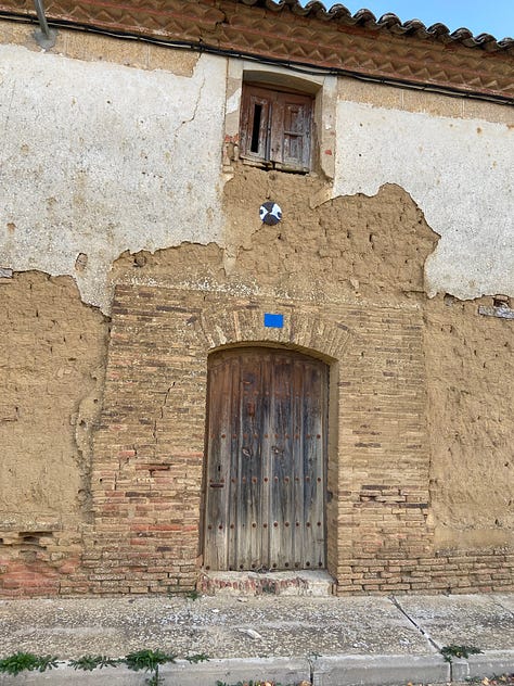 We walk for over 12 km (7 1/2 miles) on the main Camino route across the Meseta through several small towns that are totally quiet and empty of their citizenry until we reach the large town of Sahagun.
