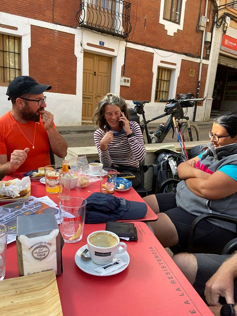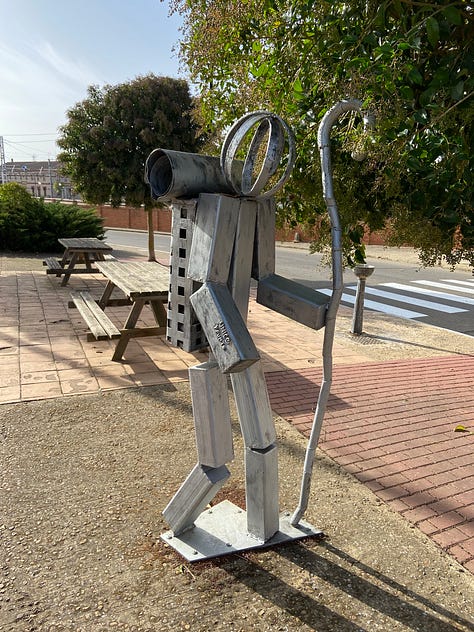 Sahagun is a prosperous town, awash in pilgrim statues and art, showcasing its importance as an “official” halfway site for the Camino. It is also a town with significant rail lines highlighting its importance as a hub for moving grain, people, and other goods across the region. Almost everyone in our “bubble” of hikers agrees that the actual halfway point occurred earlier in the walk between yesterday and today, but still we love getting a proclamation at the visitors center near the middle of town (3 Euros) which announces to those interested of our great pilgrimage achievement. A casual lunch in a local plaza with friends from the Camino gives us a chance to rest as well as celebrate our success with each other.