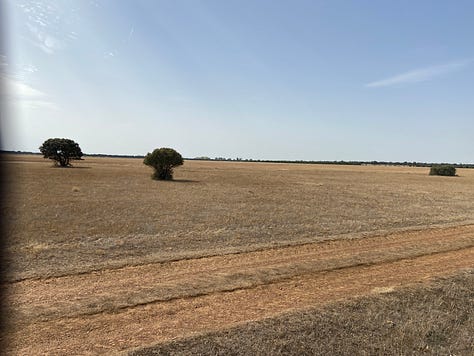 To our surprise, the next 9 km (5 1/2 miles) quickly deteriorates and makes us reconsider our decision. The long rocky road between farms, beaten up by tractors and farm equipment traveling to endless fields now plowed over, proves to be hell on my already sore and painful feet, and with a boiling afternoon sun bearing down on us as we walk, the going becomes a “slog” of endurance.