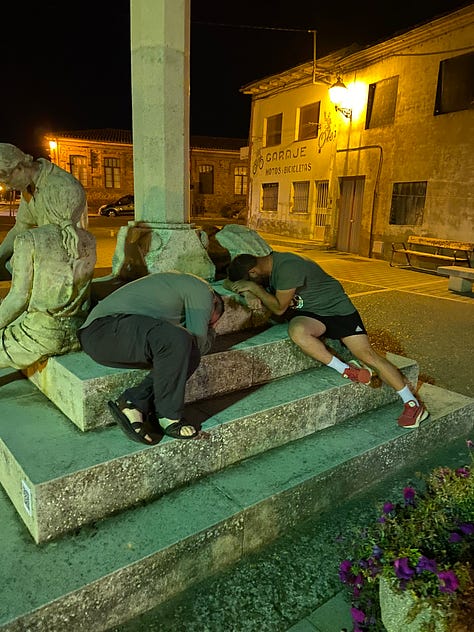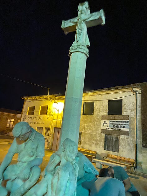 In a town where often all the beds are taken by evening, two of our friends parodied the monument of homeless pilgrims in the main square. For those without a bed, the next town is five miles away. Not a good situation for anyone.