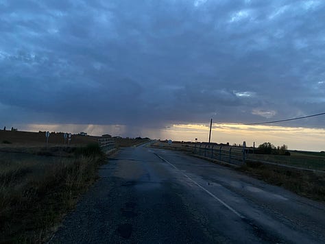 As we walk, we can see behind us that out on the Meseta the rains have opened up. Yet, we are dry. We take it as a good sign when the sun peeps through the curtain of rain clouds off in the distance.