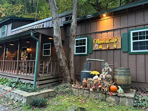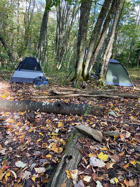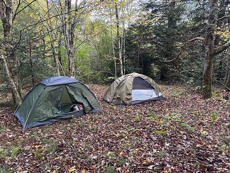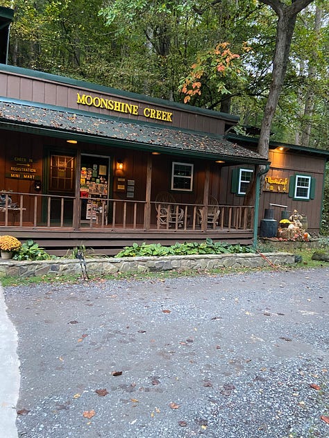 Descending 2,000 feet on the east side of Waterrock Knob—especially in clear, cool hiking weather—proves to be easier than climbing up the westside, which we did at the end of our last hike, and soon we are off the top of the mountain and walking along the Blue Ridge Parkway. Even later, for two easy miles we move quickly down on an old dirt road. The trail goes back into the woods, but still, we are making good time. We reach the Balsam Gap at the nine-and-a-half mile mark at five-thirty, but it’s here where things get confusing as we search for directions to the Moonshine Creek Campground. Finally, Ginger opens Google Maps on her phone and, after checking it several times, says in frustration, the campground is actually a mile further than the mile-and-a-half distance listed in the guidelines.