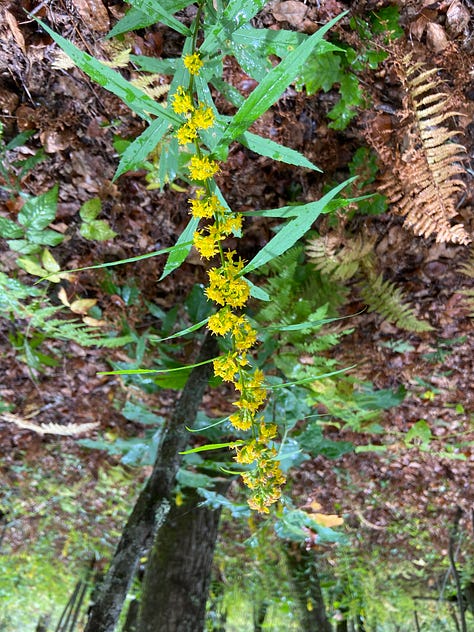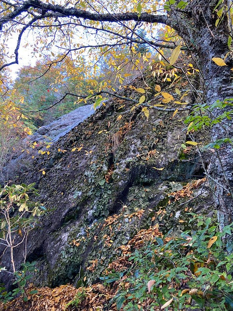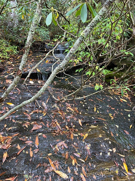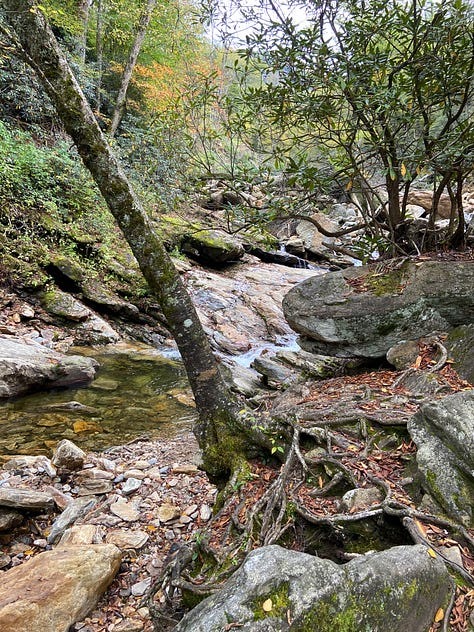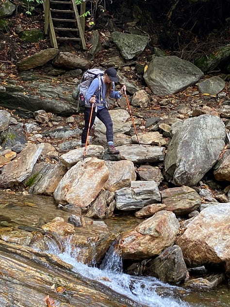 Seeing us, the hikers stop for a breather. I ask about the SAWS logos on their sweatshirts and am told they are part of the Southern Appalachian Wilderness Stewards (SAWS) and, in fact, are hiking the Little Sam to determine how much the trail has been impacted due to recent storms. SAWS, they tell us, seeks to protect the wild public lands of the Southern Appalachians. These two are in the middle of a two-year commitment, spending their days hiking the trails in the area. I want to cry. How I wish I had the freedom and the health to commit to such an endeavor!