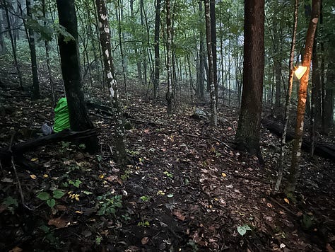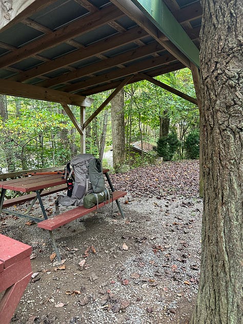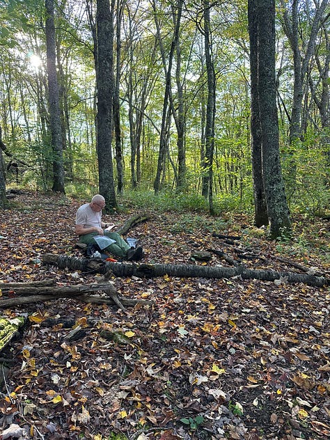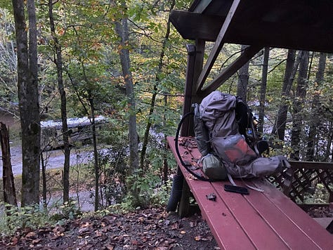 The next morning we are up early, once again. We want to cover some distance today. Certainly the idea of hiking fifteen miles is critical both to maintain our pace and to set up our tents in a designated camping area—as opposed to land prohibited by the Park Service. The next critical objective, then, is to reach the Pisgah National Forest.