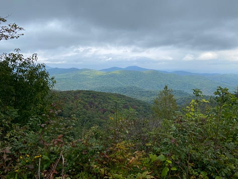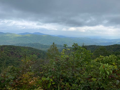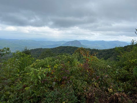An hour later we climb up to the Blue Ridge Parkway and take another short break at the Cherry Cove Overlook. If left to me, I would put up our tents here, but Ginger reminds me that camping on park land is prohibited. We must continue our hike to get back into the Pisgah National Forest—even with storm clouds brewing overhead.