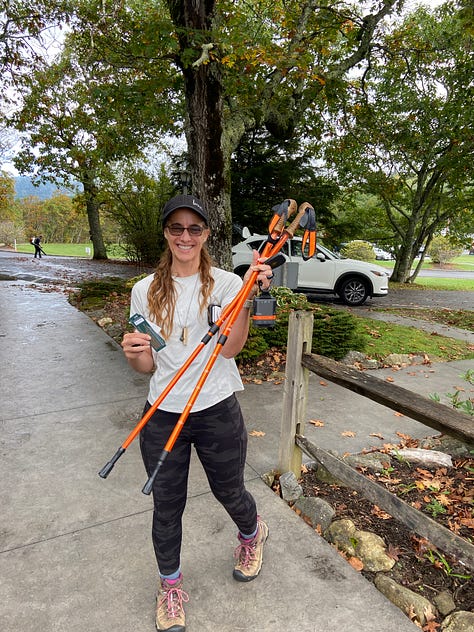 Ostensibly, our plan is to leave Ginger’s car at the Pisgah Inn and drive my car to the start of the trail. We need to begin our hike by noon in order to reach the first campsite listed in the MST guidelines before dark. We are, however, courting trouble when Ginger realizes in searching her car that she has forgotten her hiking poles. Fuck! I immediately suggest we drive to Asheville to find a hiking store, but Ginger wants to check the Inn’s gift shop first—a decidedly long-shot.