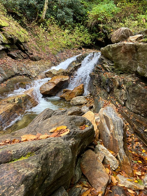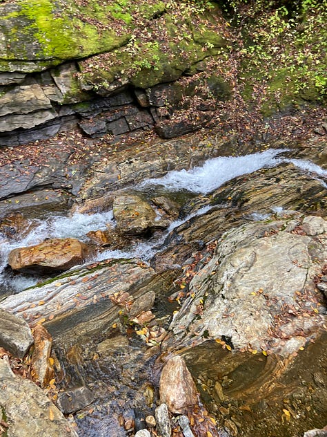 Finally, we reach an insane series of switch backs composed at each turn of large rocky, slippery steps which ultimately leads us up to the Blue Ridge Parkway and the end of our hike, the Pisgah Inn.