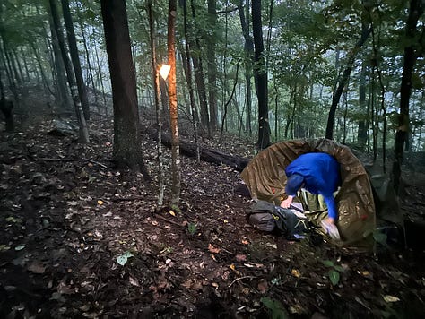 A mile later we find a spot to camp for the night. It’s a good time to settle in, with dusk upon us, and enjoy our second hot meal of rehydrated lasagna. Clearly, for us both, this meal is a hit! For once, I am not thinking about next week. Rather, I am killing cancer by being alive here, now, at this very moment.