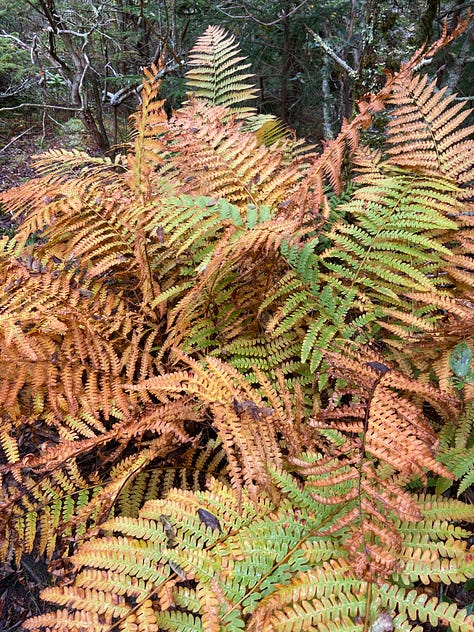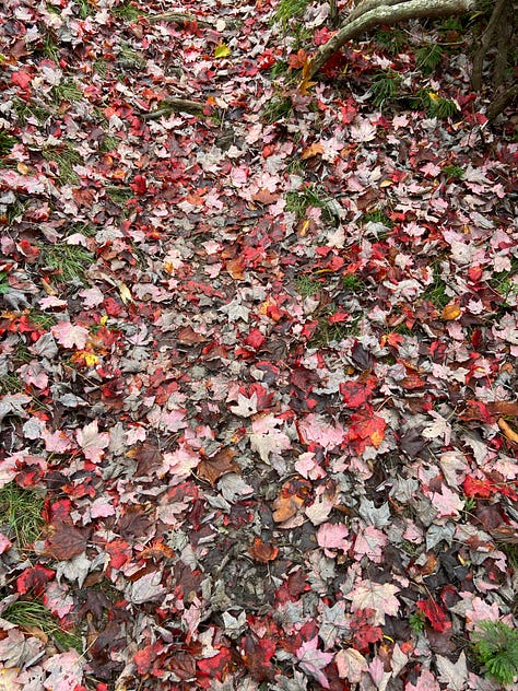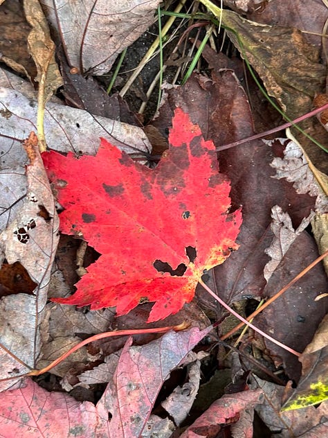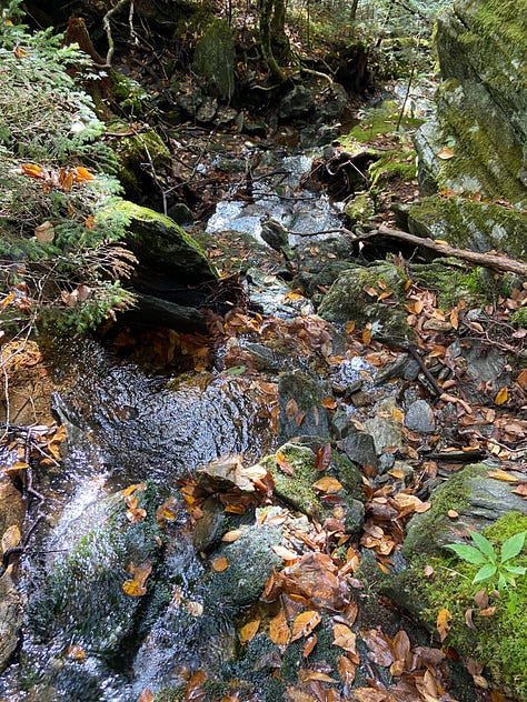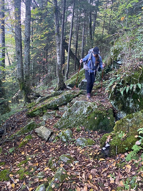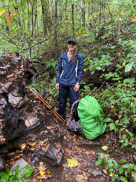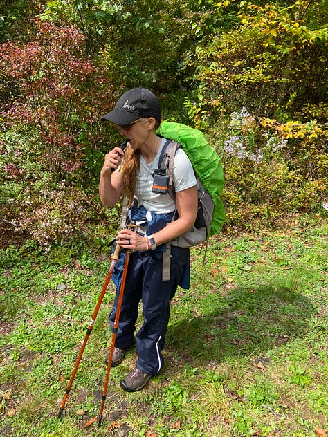 This time, I remember to turn on the GPS unit on my backpack and the tracker on my watch, and am quite proud of myself—until I realize I have forgotten to bring handkerchiefs from home. As I am at the end of a cold, I’ll be blowing my nose into dried-out maple and oak leaves that I pick up off the trail for the next five days. Ugh!
