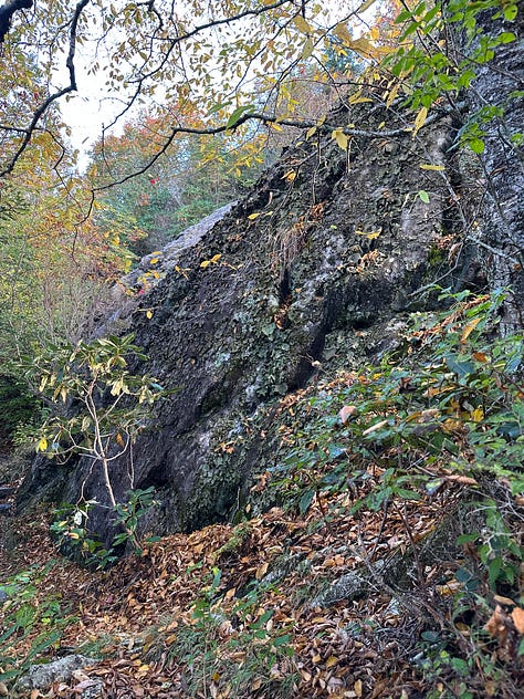 A mile later we have climbed to the top of Silvermine Bald. The clouds part briefly and the view is spectacular. As I take pictures on my phone, Ginger says we have cell service, once again. I call Karen and discover it is raining hard where we live in the middle of the state. I tell her it isn’t raining here, but with dark clouds moving in, I wonder if we might see rain soon.