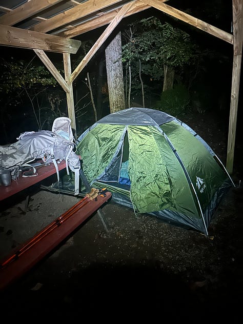 The campground, though, is nice and soon we have our tents up and make dinner of rehydrated lasagna on my little burner at a picnic table. The meal is hot and I am truly relieved and thankful that this day is over.